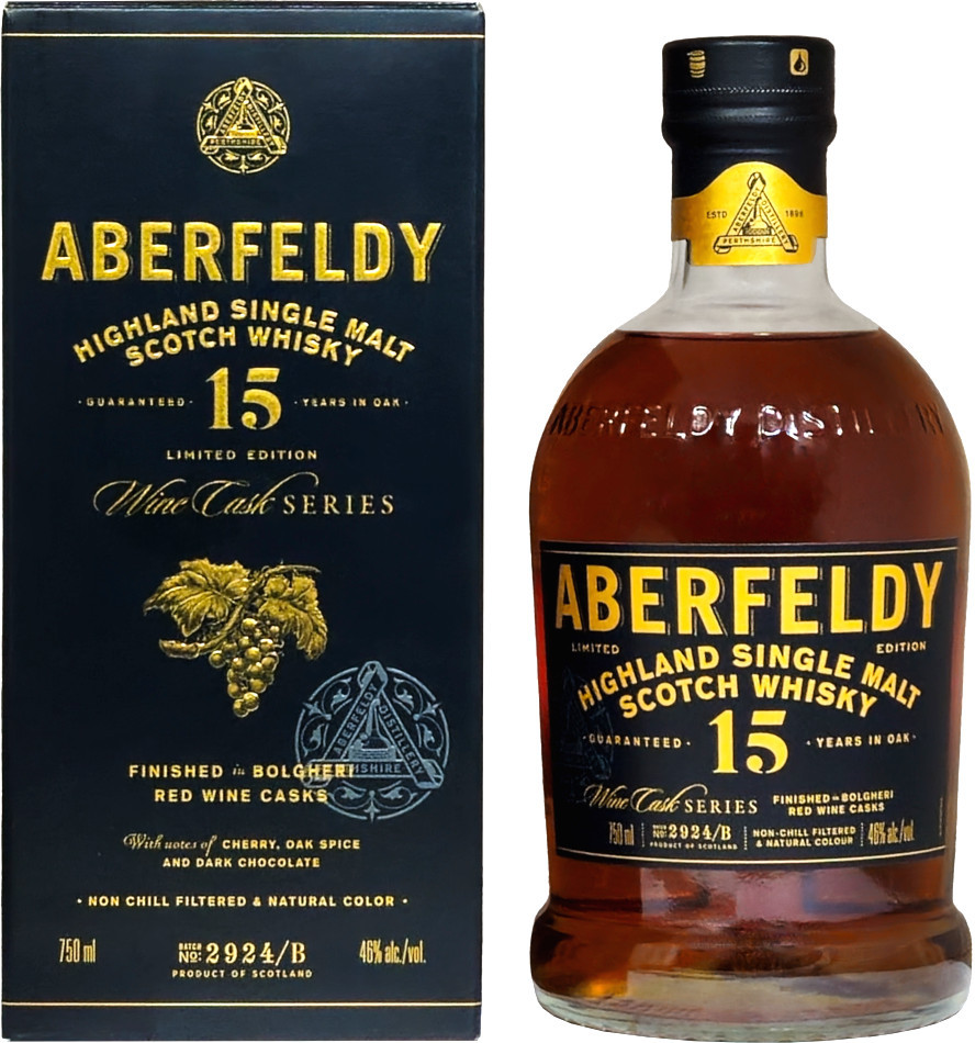 Aberfeldy 15-Year-Old Limited Edition Single Malt Scotch Whisky Finished in Napa Valley Cabernet Sauvignon Casks. The Cabernet Sauvignon wine casks from the Napa Valley bestow berries and spice, imparting a refined blush on Aberfeldy’s honeyed malt in this latest release from the Red Wine Cask Collection.