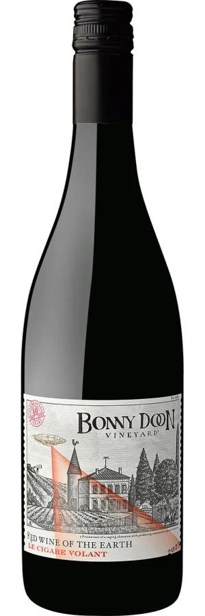 Bonny Doon Vineyard's Le Cigare Volant Red Wine of the Earth is a vibrant Rhône-style blend primarily featuring Grenache, Syrah, Cinsaut, and Petite Sirah from California's Central Coast, paying homage to the legendary Châteauneuf-du-Pape with its playful nod to the "flying cigar" UFO legend.