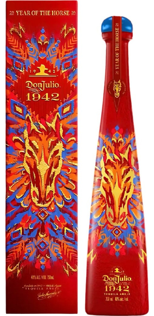 Don Julio 1942 “Year of the Horse” Limited Edition features a striking red bottle adorned with vibrant, modern artwork celebrating the spirit and power of the horse.