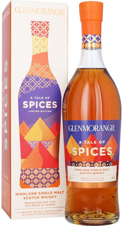 Glenmorangie A Tale of Spices draws inspiration from global spice markets, capturing their aromas and flavours in whisky form. It is matured in a combination of Moroccan red wine, new charred oak, pedro ximenez sherry and toasted red wine casks.
