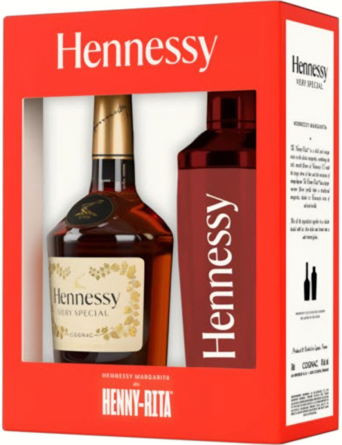 A bold gifting set featuring a 750ml bottle of Hennessy V.S and a custom cocktail shaker with etched measurements for crafting the Henny-Rita and other classic Hennessy serves. A recipe card on the back inspires easy cocktail-making at home.