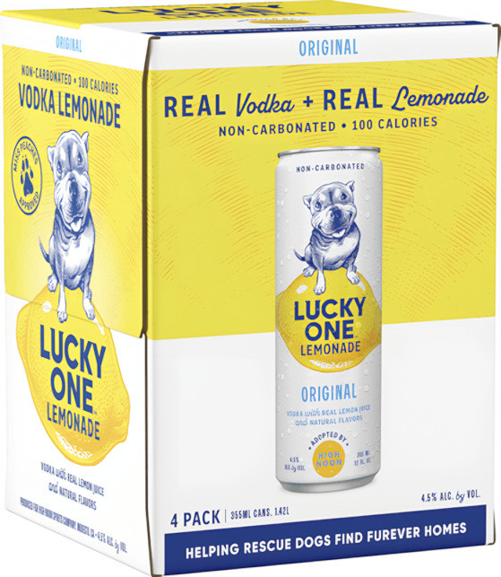 Lucky One Vodka Lemonade is non-carbonated, made with real vodka and real fruit juice. Only is 100 calories and helps rescue dogs find fur-ever homes! Bright and juicy lemon with a light layer of sweet white sugar and no carbonation.