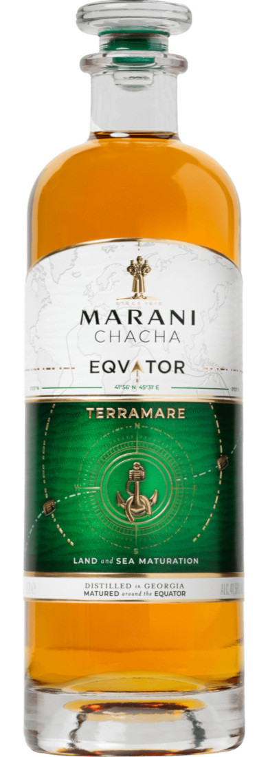 Marani Chacha Eqvator Terramare is a distinctive Georgian spirit crafted from traditional grape pomace and finished with a unique land-and-sea maturation process. Its warm amber color hints at rich, layered flavors with a smooth, refined character.