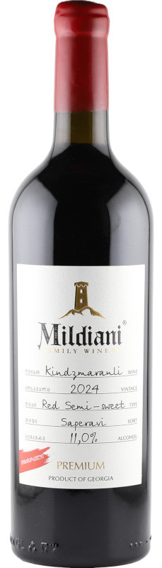 Mildiani Kindzmarauli Premium 2024 is a semi-sweet red wine crafted from the Saperavi grape in Georgia’s renowned Kindzmarauli region. It features rich aromas of ripe berries, cherries, and subtle spice, balanced by a smooth, velvety sweetness.