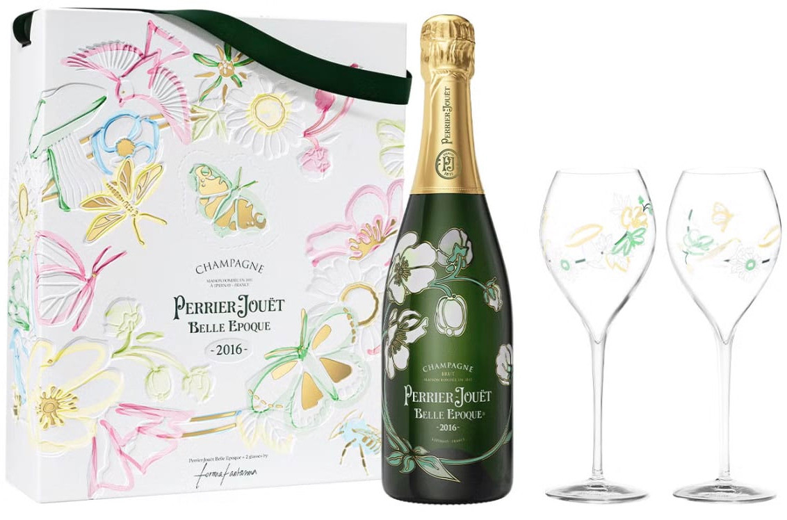 Perrier-Jouët Belle Epoque 2016 Gift Set is an elegant expression of vintage Champagne, presented in an artistic floral box with two branded glasses. Crafted primarily from Chardonnay, it offers refined aromas of white flowers, citrus, and subtle brioche with a silky, balanced palate.