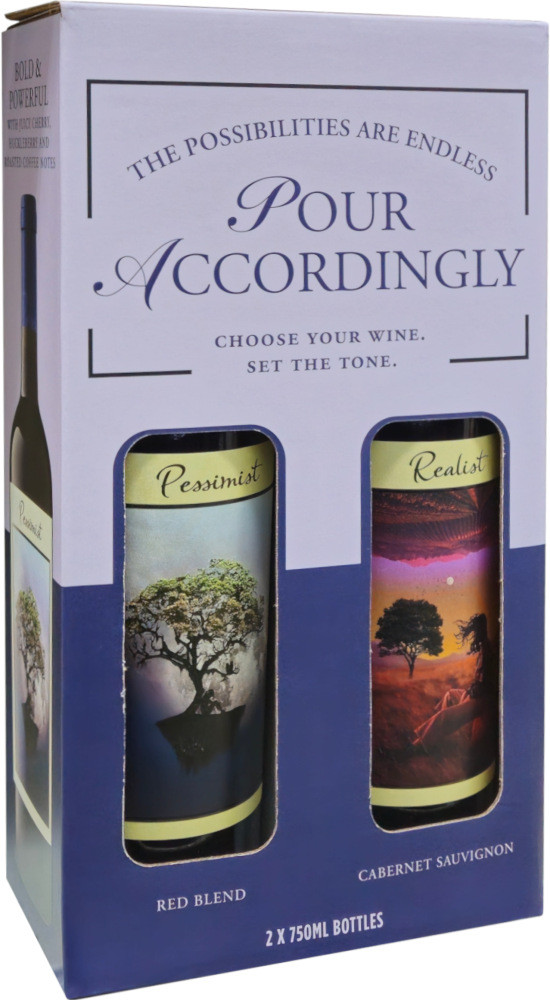 The Pour Accordingly Gift Set features two expressive California wines — the Pessimist Red Blend and the Realist Cabernet Sauvignon — designed to suit every mood and moment.