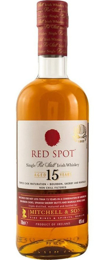 Red Spot is aged for a minimum of 12 years in bourbon barrels, Spanish sherry butts and Sicilian Marsala wine casks. It is classified as single pot still Irish whiskey, which means it is pot-distilled at a single site from a mixture of malted and unmated barley. Brand tasting notes describe it as having baked apple and hazelnut on the nose and sweet fruit and black pepper on the palate.
