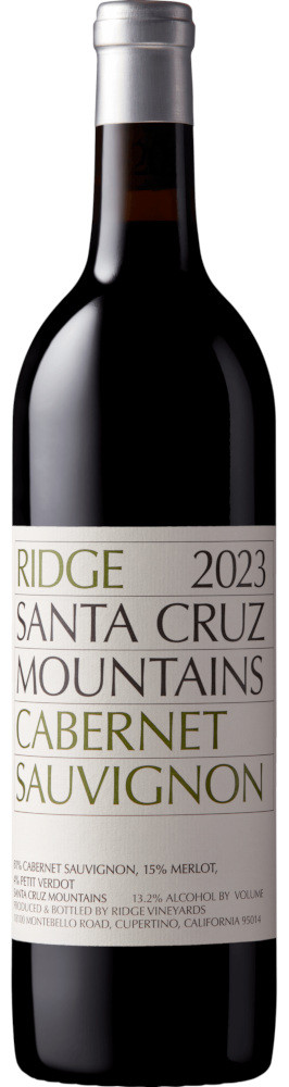 Ridge Santa Cruz Mountains Cabernet Sauvignon 2023 is a distinguished California red wine blending Cabernet Sauvignon with touches of Merlot and Petit Verdot. It reveals deep aromas of blackcurrant, plum, and cedar, complemented by refined tannins and a lingering finish.