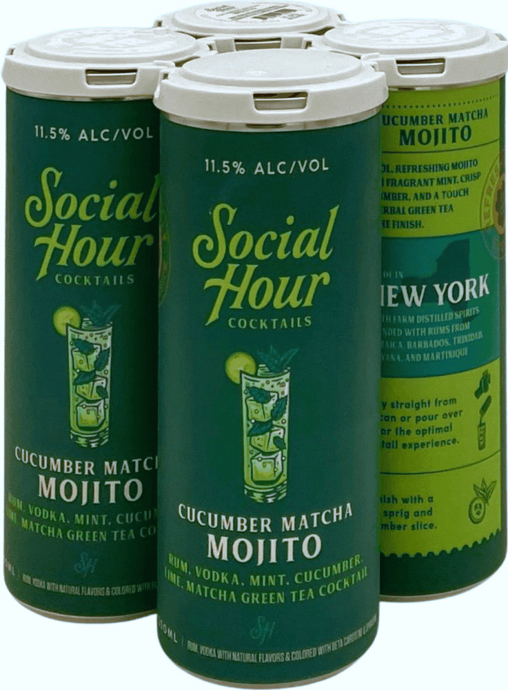 Social Hour Cucumber Matcha Mojito is a refreshing ready-to-drink cocktail crafted with rum, vodka, mint, cucumber, lime, and a touch of matcha green tea. At 11.5% ABV, it delivers a crisp and herbaceous flavor with a smooth finish.