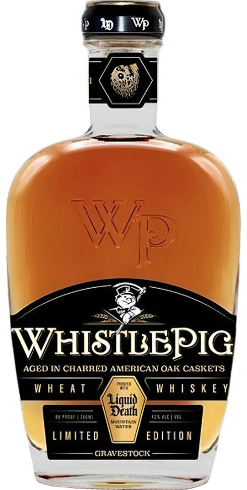 Introducing the WhistlePig x Liquid Death Gravestock Wheat Whiskey, a bold limited edition aged in charred American oak casks. Crafted with precision and finished with pure Liquid Death mountain water, this wheat whiskey delivers a smooth, rich character with notes of vanilla, spice, and toasted oak.